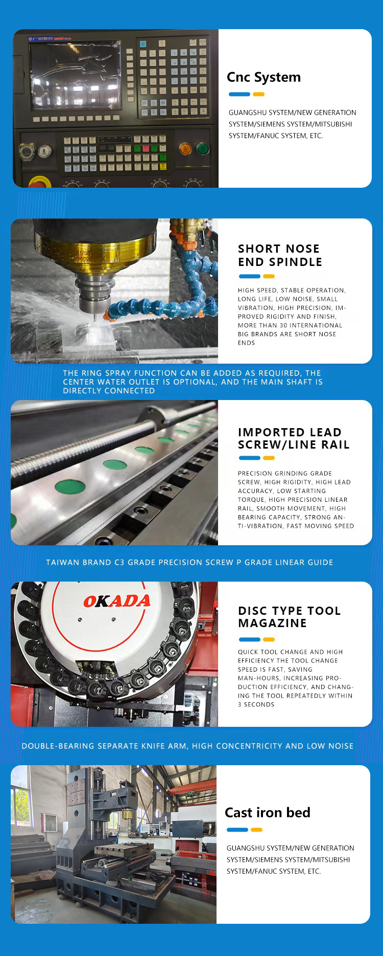 Taiwan HIWIN high precison guideway Taiwan-made spindle Unit,8000-12000rpm available.Reliable Control System: vmc850 cnc milling machine machining center is suitable for producing metal product and parts in all shapes. Taiwan spindle adopts high-quality bearings with good rigidity. BT40 tool handle is standard and BT40 tool handle is optional.HT300 cast iron is adopted for the main foundation parts such as base, sliding seat, workbench, column and headstock; vmc850s cnc milling machine The substructure is a box structure, and the compact and reasonable symmetrical reinforcement structure ensures the high rigidity, vmc850s cnc milling machine bending resistance and damping performance of the foundation parts; A-span column and internal grid reinforcement effectively ensure the rigidity and accuracy of z-axis strong cutting;
